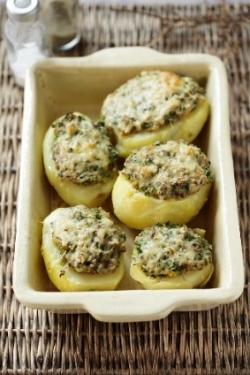 Punjene krompire stavite u namazanu tepsiju i pecite u rerni oko 20 minuta.