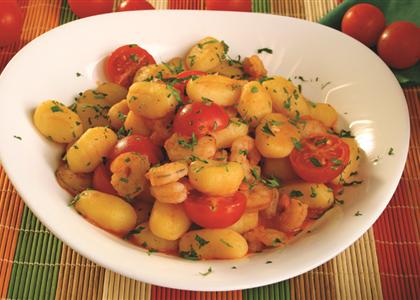 Na kraju dodati barene njoke i na polovine isečen čeri paradajz.