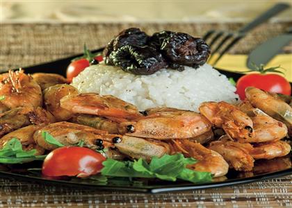 Pirinač sa rukolom staviti na sredinu tanjira za posluživanje a preko poređati gambore, te preliti sosom od konjaka i suvih šljiva.