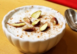 Svaku zdjelicu odozdo pospemo cimetom u prahu, a po tome sitno isjeckanim orasima, lješnicima, bademima, pistacijama, ili nekim drugim koštunjavim voćem koje imamo pri ruci.
