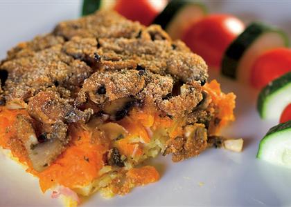 Na dno činije staviti prvo masu od kompira, preko nje masu od šargarepe i na kraju masu od pečuraka.