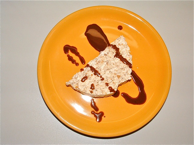 Poslužiti rezano na šnite debljine 2cm i servirati sa čokoladnim preljevom