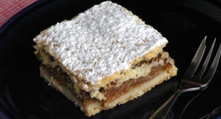 Tijesto podijeliti na dva dijela. Pleh namastiti i pobrašniti. Jednu polovicu tijesta razvaljati prema kalupu ili plehu, pažljivo prenijeti u pleh, posuti s 5 dkg oraha i peći u zagrijanoj pečnici na 150°C 20-30 minuta.Izvaditi iz pečnice, naribane jabuke lagano ocijediti od viška tekućine, složiti preko pečene kore, posuti ostatkom oraha, cimetom vanili šećerom i običnim šećerom prema okusu. Ovako pripremljene jabuke prekriti korom od drugog dijela tijesta. Gornju koru izbosti vilicom (ravnomjerno na 15-ak mjesta) kako kora ne bi popucala. Pripremljenu pitu staviti u pečnicu na 175°C i peći 40-ak minuta. Narezati na kocke (ako se peče u plehu) ili šnite (ako se peče u okrugom modlu), te po okusu posuti s šećerom u prahu.