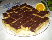 Fil: napravite šerbet od 200 grama šećera i 7 kašika vode (treba da proključa samo jedan ključ). U ovako pripremljen šerbet izmrvite polovinu tijesta i izrendajte pomorandžu koju ste prethodnog dana dobro oprali i stavili u zamrzivač. Pomorandža se renda sa korom na najsitnijoj strani rendeta. Polovinu tijesta premažite sa malo džema od kajsija i nafilujte smjesom koju ste napravili. Na kraju prelijte glazurom od čokolade koju ste istopili na pari. Ako nemate u kući čokoladu, možete da je napravite sami od malo maslaca, mlijeka i kakaa. Kolač ohladite u frižideru, a zatim isjecite na kocke.