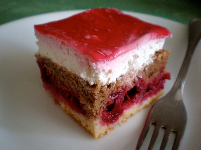 Izraditi žumanjke sa šećerom,dodati margarin a, zatim kajmak i brašno sa praškom za pecivo.Na kraju umješati snijeg od bjelanjaka,gore poslagati ocjeđene višnje i peći.