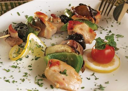 Zajedno sa šampinjonima i suvim šljivama nanizati sve sastojke na žice za ražnjiće, začiniti i peći na zagrejanom ulju u gril tiganju.