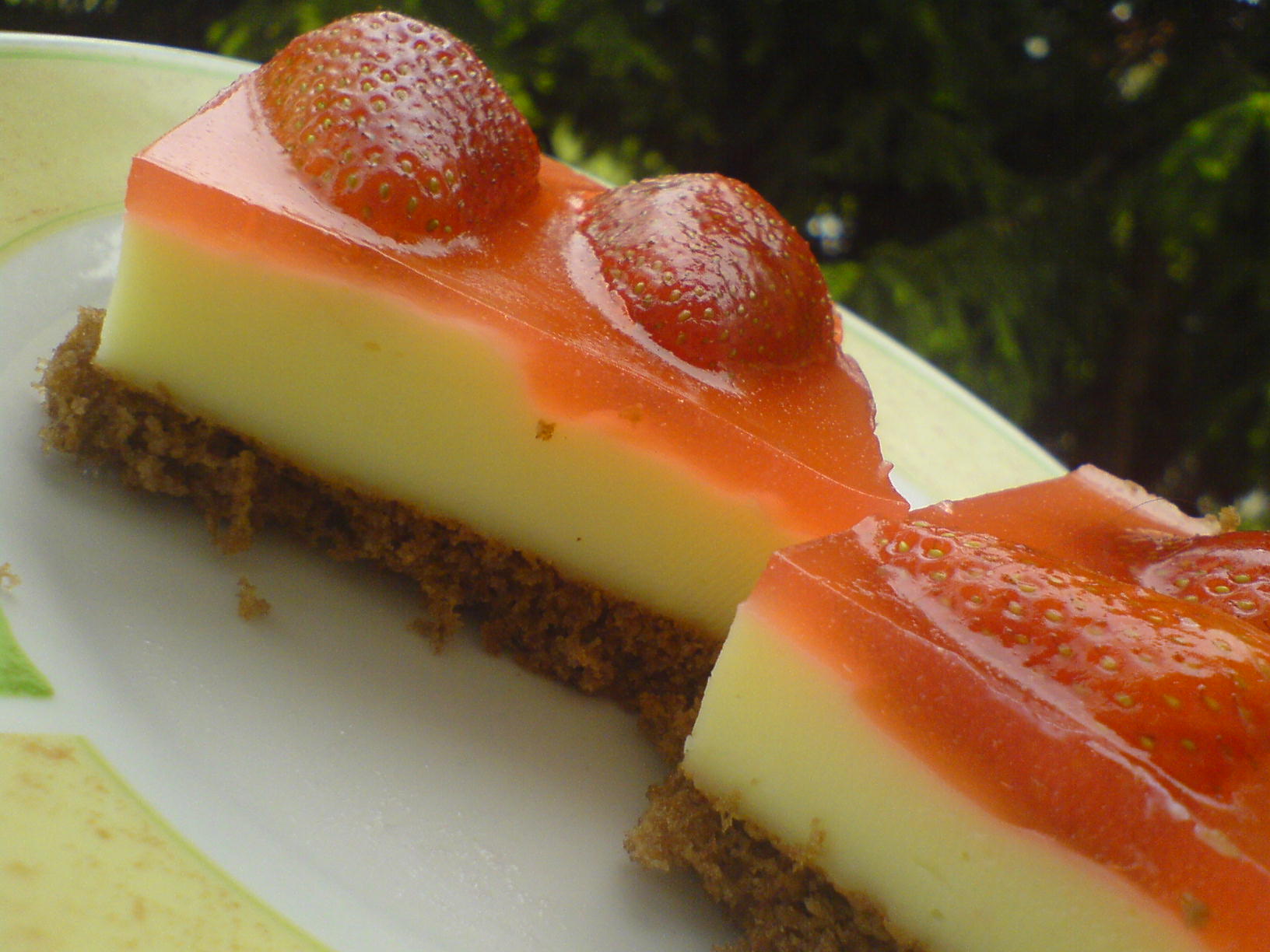 Krema:6dl mlijeka, 2 praška za puding od vanilije i još:oko 200g jagoda i jedan crveni preljev za torte.