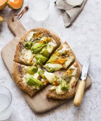 Započnite ovaj recept za bianca pizzu s cvjetovima tikvica tako što ćete pripremiti kompletno tijesto. U zdjelu robota opremljenu kukom stavite dva brašna i kvasac u sredinu. Do ruba dodajte šećer i sol . Kvasac preliti sa 8 cl mlake vode i ostaviti da djeluje 5 minuta. Zatim uliti još 10 cl tople vode i maslinovog ulja. Mijesiti 8 min. Pokrijte čistom kuhinjskom krpom i ostavite da odstoji 1 sat. Tijesto mora udvostručiti volumen. Zatim otplinite tijesto tako što ćete nekoliko puta snažno gurnuti šaku u njega, a zatim ga raširiti na pobrašnjenu radnu površinu. Stavite tijesto na pleh obložen papirom za pečenje prije nego ga napunite.Zagrijte pećnicu na 200°C, ostavite posudu za pizzu unutra. Tijesto razvaljajte na pobrašnjenoj radnoj površini i stavite na drugi lim (ili dasku) obložen papirom za pečenje.