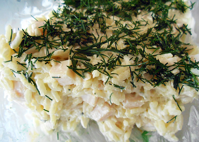 Kad se pirinač ohladi dodajte iseckane krastavčiće, šunku i mirođiju, a zatim pavlaku, majonez i senf.