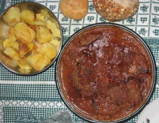 Nakon sat vremena, meso izvaditi, iseći na šnicle i prepržiti ga sa svih strana na izdinstanom luku.