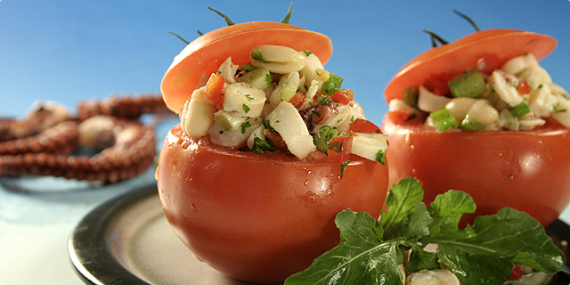 4 Rajčicama odrežite gornji vrh i žlicom izdubite sredinu. Punite ih pripremljenom salatom od hobotnice.