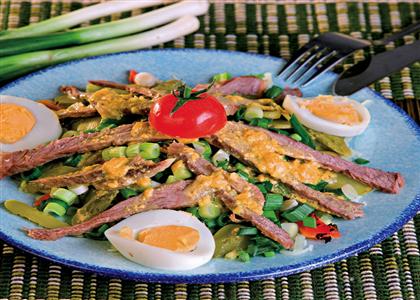 Salatu preliti dresingom, servirati na tanjir, dodati kolutove barenih jaja i poslužiti uz krišku crnog hleba.