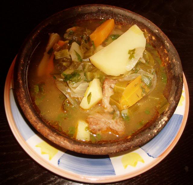 Govedje meso isjeci na krupne kocke (tri do cetiri kocke po porciji).Sve povrce ocistiti,oprati i isjeci na krupne kocke (kao i meso), sve staviti u vecu serpu (i meso i povrce), dodati vino, soli po ukusu, biber u zrnu, aleve paprike, jedan karanfilic, lagano izmjesati, sloziti u zemljani lonac (moze i obicni), naliti hladnom vodom, povezati pergament papirom, prokuhati na stednjaku, a zatim peci u pecnici dva do tri sata (zavisno od starosti mesa).