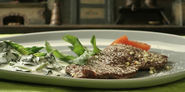 Ramsteak na žaru s prilogom od špinata