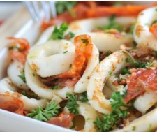 Isperite i osušite kolutove lignji. Uklonite kožu s choriza i narežite ga na vrlo tanke ploške. Ogulite i nasjeckajte režnjeve češnjaka. Isperite, osušite i nasjeckajte peršin. Rajčice uronite na 1 min u kipuću vodu kako bi se lakše ogulile, a zatim ih sjemenite i narežite na male komadiće.