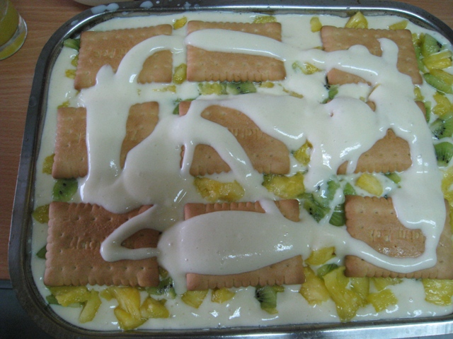 Zatim prelijete krem preko keksa i dodate voće od gore.