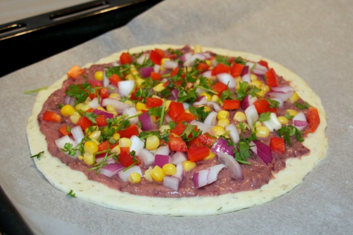 Paštetom od graha premažite razvučenom tijesto a na kraju posipajte sve nasjeckanim povrćem.