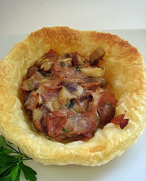 Lisnato tijesto razvaljati i izrezati na krugove. Neke manje keramičke posudice premazati s malo maslaca/margarina s vanjske strane, okrenuti ih naopačke i preko njih prebaciti izrezane krugove lisnatog tijesta. Peći dok lijepo ne porumene.