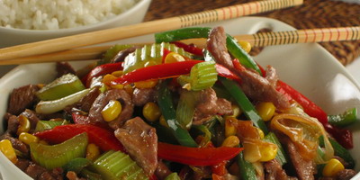 2 Na zagrijanom ulju popecite janjetinu, dodajte na rezance narezan mladi luk, papriku, celerovu stabljiku i Vegetu. Promiješajte i pirjajte oko 10 minuta.