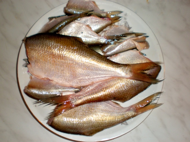 Očišćenu ribu uvaljati u brašno pomiješano sa crvenom paprikom i pržiti u dubokom ulju sa obje strane dok ne porumeni.