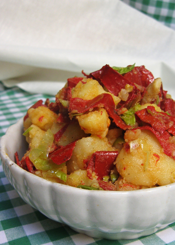 Spojite topao krompir, suvu papriku, i praziluk. Začinite solju, biberom, uljem i sirćetom.
