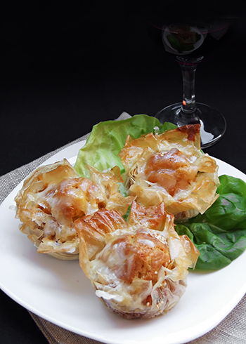 Presavijenu koru stavite u namašćen pleh za mafine. Uzmite drugu kockicu od kore i ponovo je presavite pa je stavite u pleh – modlicu – sa prvom korom, suprotno od nje. U jedno udubljenje, idu po dve kore.