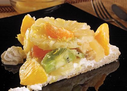 Služiti toplu parčad pice i po želji preliti voćnim topingom i posuti struganom korom limuna.
