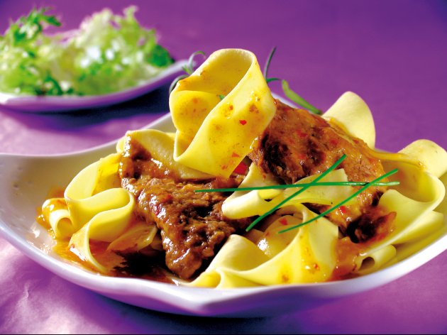 Taljatele sipajte u tanjire, a odozgo prelijte mesom u sosu.