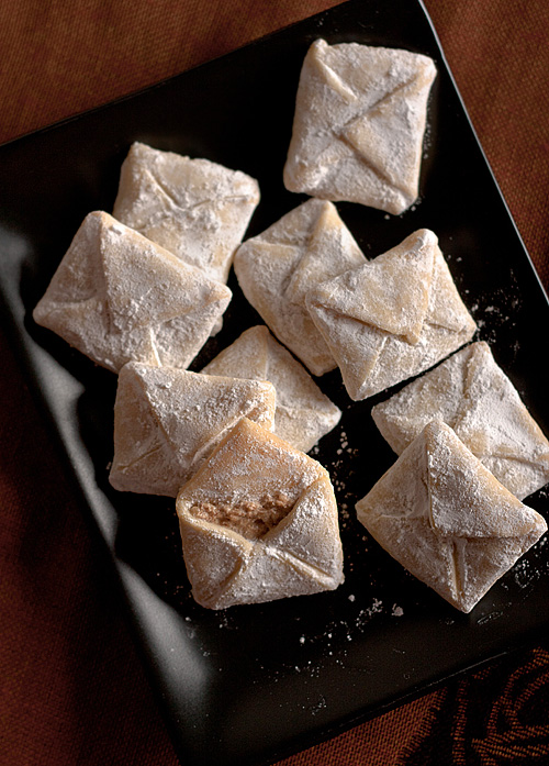 Testo iseći na 16 kvadrata dimenzija 6 x 6 cm. Na sredinu svakog staviti po sasvim malo fila, pa sklopiti testo da dobije oblik pisma/koverte.
