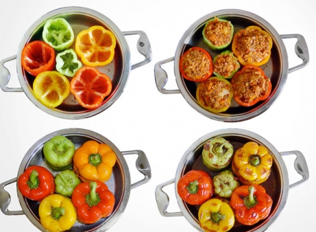 Iseckajte sitno crni luk, propržite na ulju i kada postane staklast dodajte sitno seckane pečurke, propržite još koji minut, dodajte seckani peršun i pirinač, začinite i ostavite da se malo ohladi.Za to vreme paprike operite i očistite.