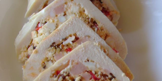 2 Papriku, sunku i tvrdo kuvana jaja sitno iseckati i pomesati sa izgnjecenim feta sirom. Susam proprziti bez masnoce i pomesati sa sirom. Sve to sipati u pleh preko piletine, dobro poravnjati i odozgo, takodje poredjati piletinu. Sve dobro zatvoriti alu – folijom i peci na 200 stepeni, oko 30 minuta. Po zelji izruciti iz pleha i zapeci i gornju stranu.