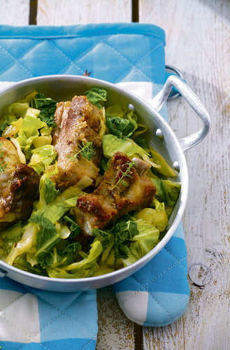 3 Ogulite kruške i narežite ih na kockice. Pospite ih smeđim šećerom pa bacite u tavu na vatru da se malo karameliziraju. Podlijte vinom i dodajte gorušicu pa pustite da se kuha, a umak se reducira do željene gustoće. Izvadite rebarca iz pećnice.